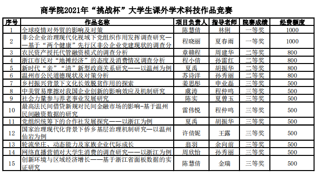 经过评委老师综合了文本评审、路演陈述及自由问辩等环节的评议,最终评选出院赛一等奖2项、二等奖4项、三等奖9项。同时,国产自拍将予以各组(院一等奖1000元,二等奖800元,三等奖500元)项目孵化经费作为奖励。具体项目获奖名单如下: